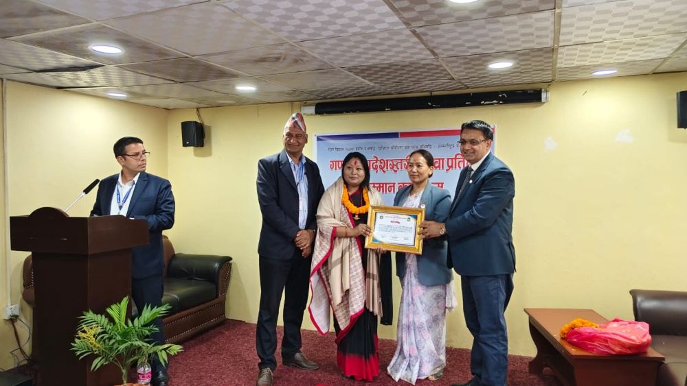 गण्डकी प्रदेशका सामाजिक विकास, युवा तथा खेलकुद मन्त्री रेखा गुरुङले सम्मान पत्र र प्रदेश सचिव डा. शेषनारायण पौडेलले दोसल्ला लगाएर उहाँलाई सम्मान गर्नुभएको  हो |