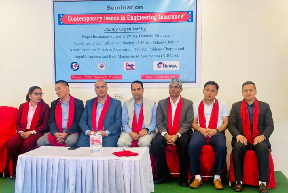 पाेखरा, २४ जेठ । नेपाल बीमा प्राधिकरण (NIA), गण्डकी प्रदेश, नेपाल इन्स्योरेन्स प्रोफेसनल सोसाइटी (NIPS), पोखरा च्याप्टर, नेपाल इन्स्योरेन्स सर्भेयर संघ (NISA), पोखरा च्याप्टर, नेपाल इन्स्योरेन्स तथा जोखिम व्यवस्थापन संघ (NIRMA) काे संयुक्त रूपमा “इञ्जिनियरिङ इन्स्योरेन्सका समसामयिक विषयहरू” विषयक एक दिवसीय सेमिनार शनिबार पाेखरामा आयोजना गरिएको छ ।