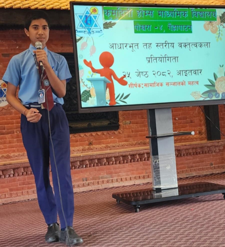 पोखरा, २६ जेठ। पोखराको गैह्रापाटनमा अवस्थित कुमुदिनी होम्स माध्यमिक विद्यालयमा सोमबार अतिरिक्त क्रियाकलाप अन्तर्गत आधारभूत तह (६-८) र माध्यमिक तह (९ र १०) को नेपाली वक्तृत्वकला प्रतियोगिता सम्पन्न भएको छ ।