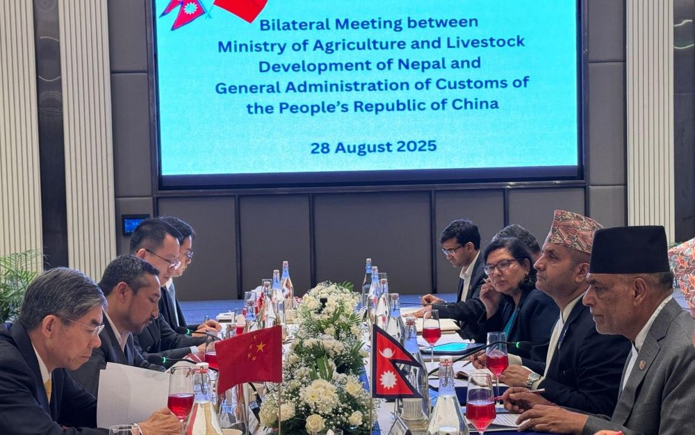 चीनको भन्सार प्रशासन र कृषि तथा पशुपन्छी मन्त्रालयका उच्च अधिकारीबीच काठमाडौँमा भएको द्धिपक्षीय बैठकमा नेपालले गरेको आग्रहलाई चिनियाँ पक्षले सकारात्मकरूपमा लिएको जनाएको छ । बैठकमा नेपालको नेतृत्व कृषि तथा पशुपन्छी विकासमन्त्री रामनाथ अधिकारीले गर्नुभएको थियो भने चीनको भन्सार प्रशासनका उपमन्त्री वाङ्ग लिङजुनले चिनियाँ पक्षको नेतृत्व गर्नुभएको थियो ।