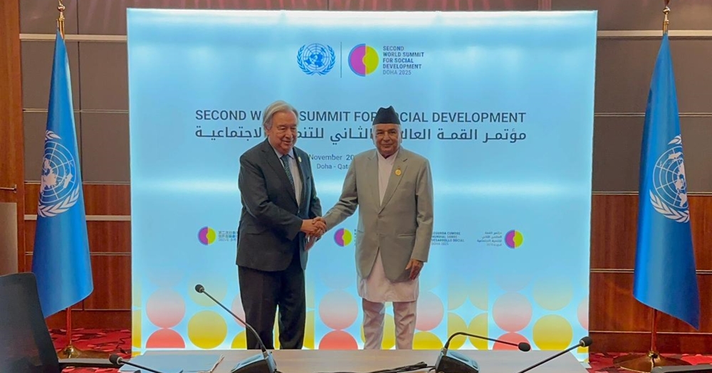 काठमाडौँ, १८ कात्तिक। ‘सामाजिक विकासका लागि दोस्रो विश्व शिखर सम्मेलन’मा सहभागी हुने सिलसिलामा कतारको राजधानी दोहामा रहनुभएका राष्ट्रपति रामचन्द्र पौडेलसँग संयुक्त राष्ट्रसङ्घका महासचिव एन्टोनियो गुटेरेसले आज शिष्टाचार भेट गर्नुभएको छ ।